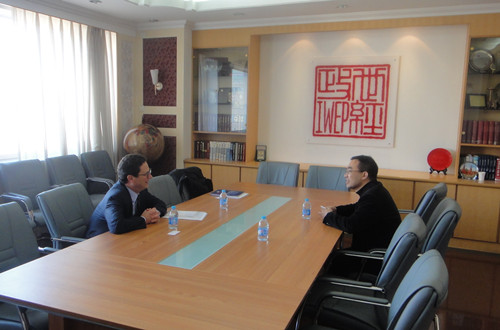 Deputy Director He Fan meets with Chief Economist Charles Collyns from Institute of International Finance, and discusses with him about the current economic situation and prospects of government reform programs. (2013-11-20)